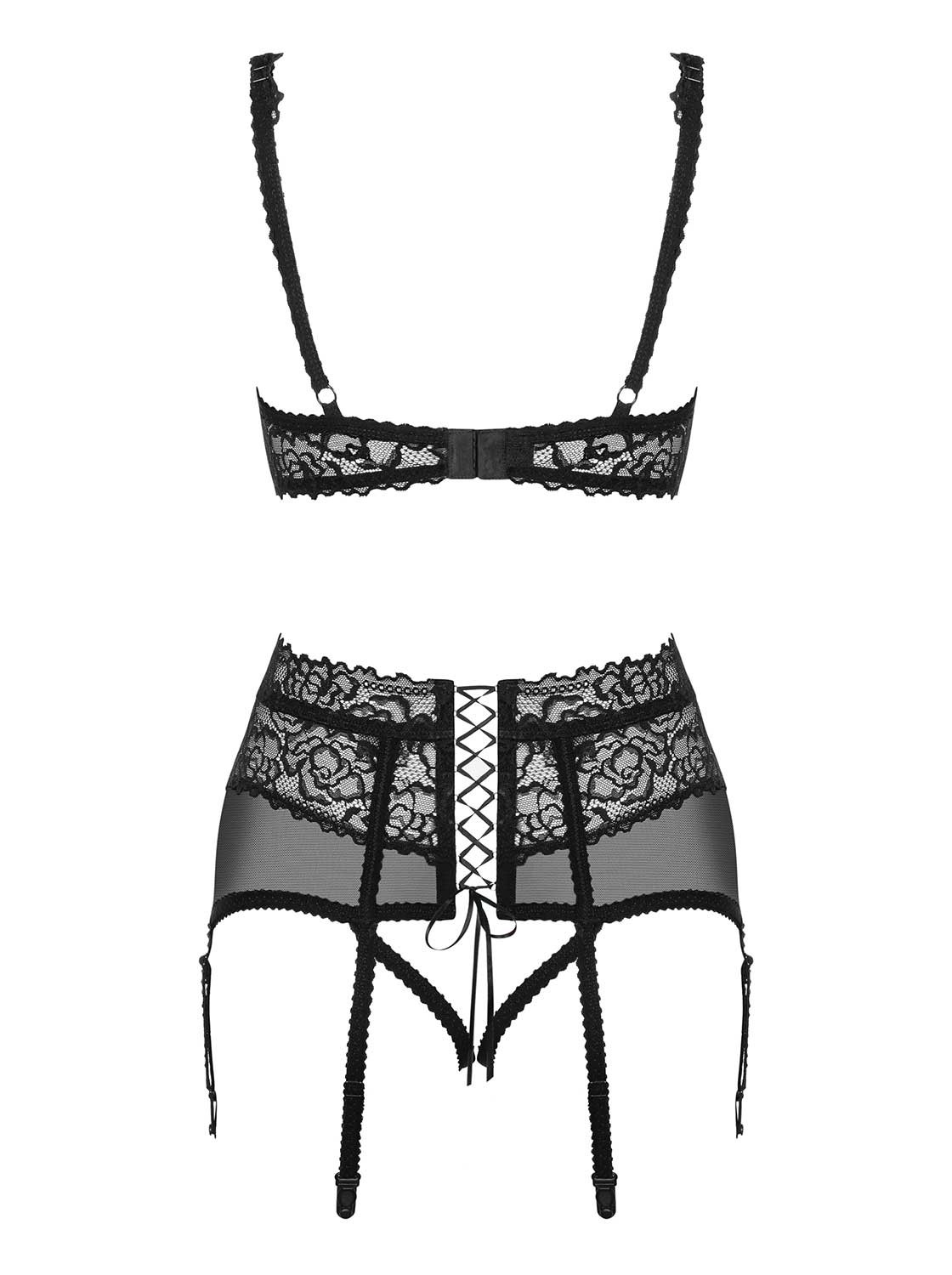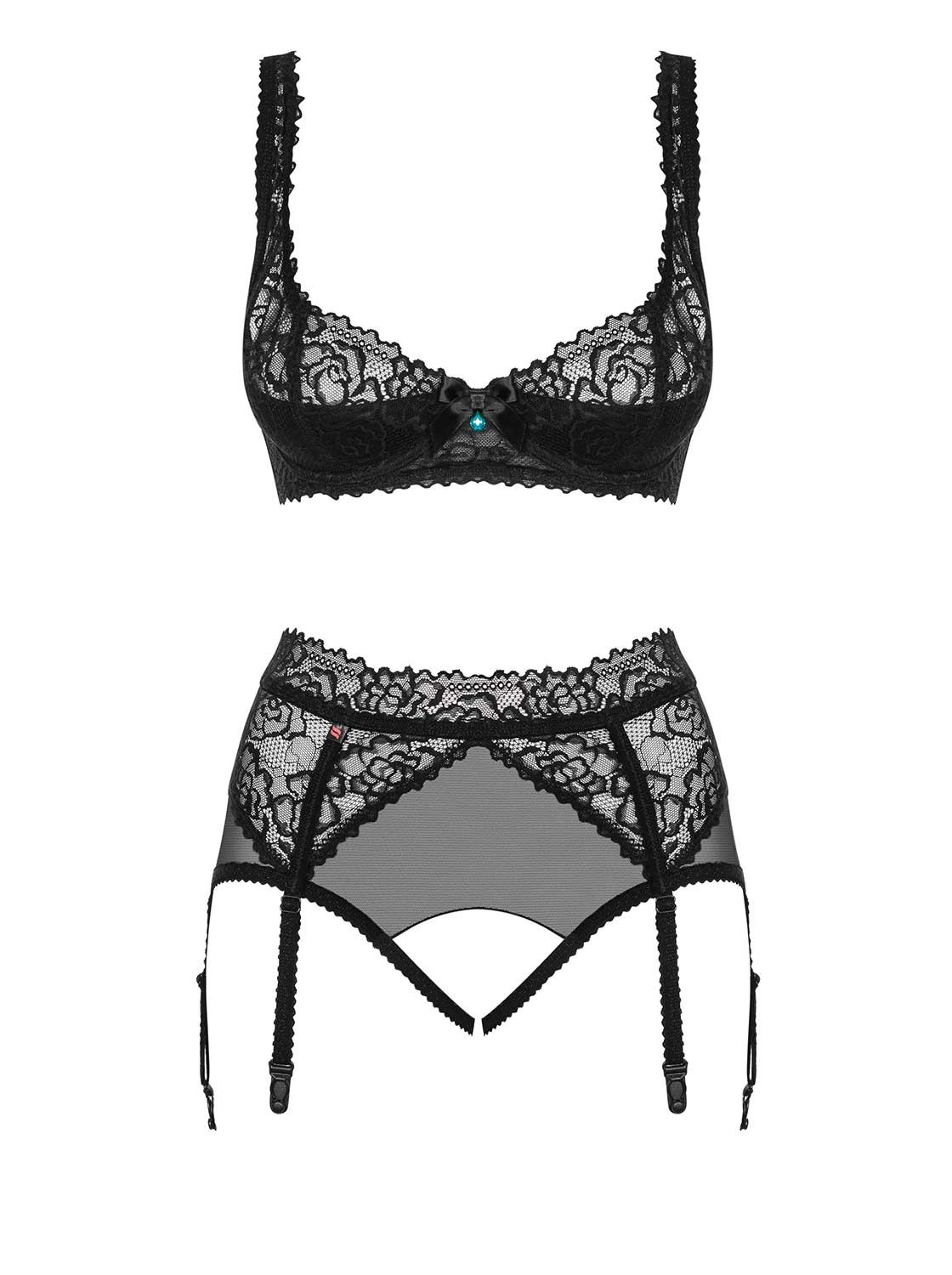 Lindo conjunto de 2 peças composto por sutiã e cinta-liga/cuecas com aberturas.